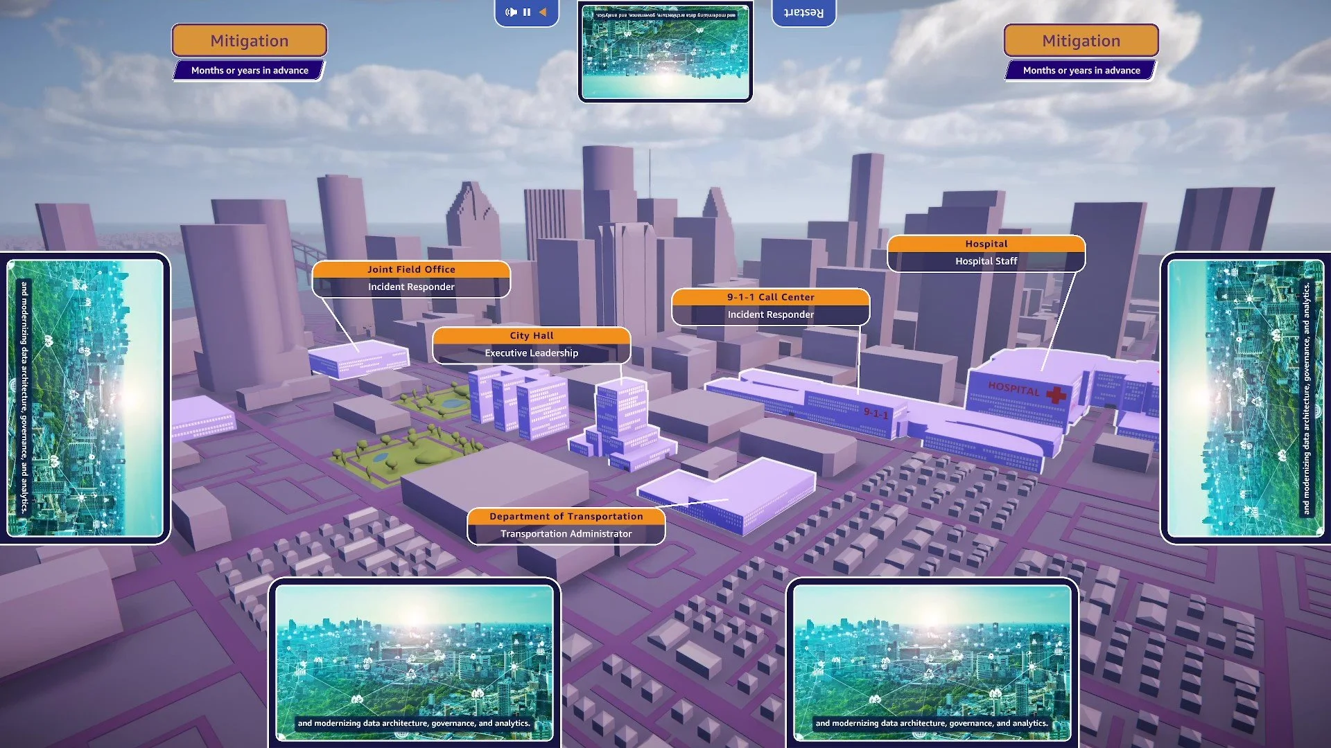 For this project, I worked alongside Unity Developer Zac King, Creative Director Steve Deitz, Designer Chloe Kim, and Visual Content Artist Justin Foshee to create an interactive experience for Amazon Web Services’ Government division, showing how AWS can help in a severe weather event. I started by blocking out the city in 3D, basing the building designs on a model of the city of Houston. I modified and created a custom mesh to create the final city model. For this project, I utilized Enviro, a Unity Plugin meant to help manage and generate realistic sky & weather. This plugin allowed me to create custom weather events, darkening skies, adjusting cloud cover, and spawning rain particles, which were hand-modified to simulate a hurricane. This project also required several custom shaders used to control custom emissive highlights and a panning water texture.