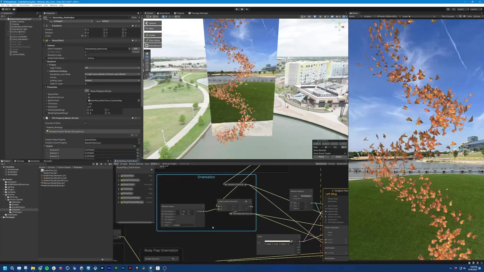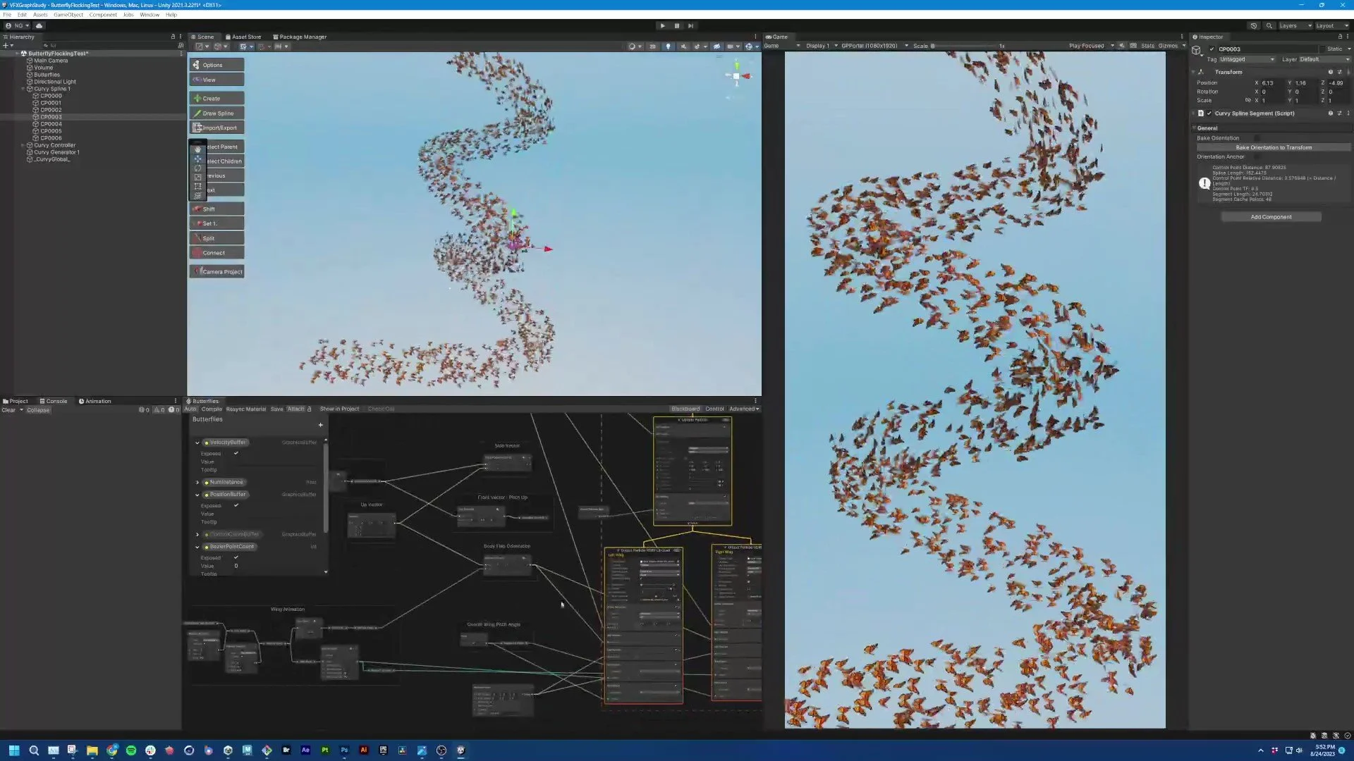 For this project, I utilized Unity HDRP, VFX Graph, and Shader Graph to create a customizable, flexible, and functional dynamic butterfly fx system. It utilized multi-point spline sampling and custom vector-based algorithms to keep butterflies oriented tangent to the input spline. This system is made to take a wide variety of shapes, curves, and particles with exposed properties that could give artists more control based on custom parameters at real-time.